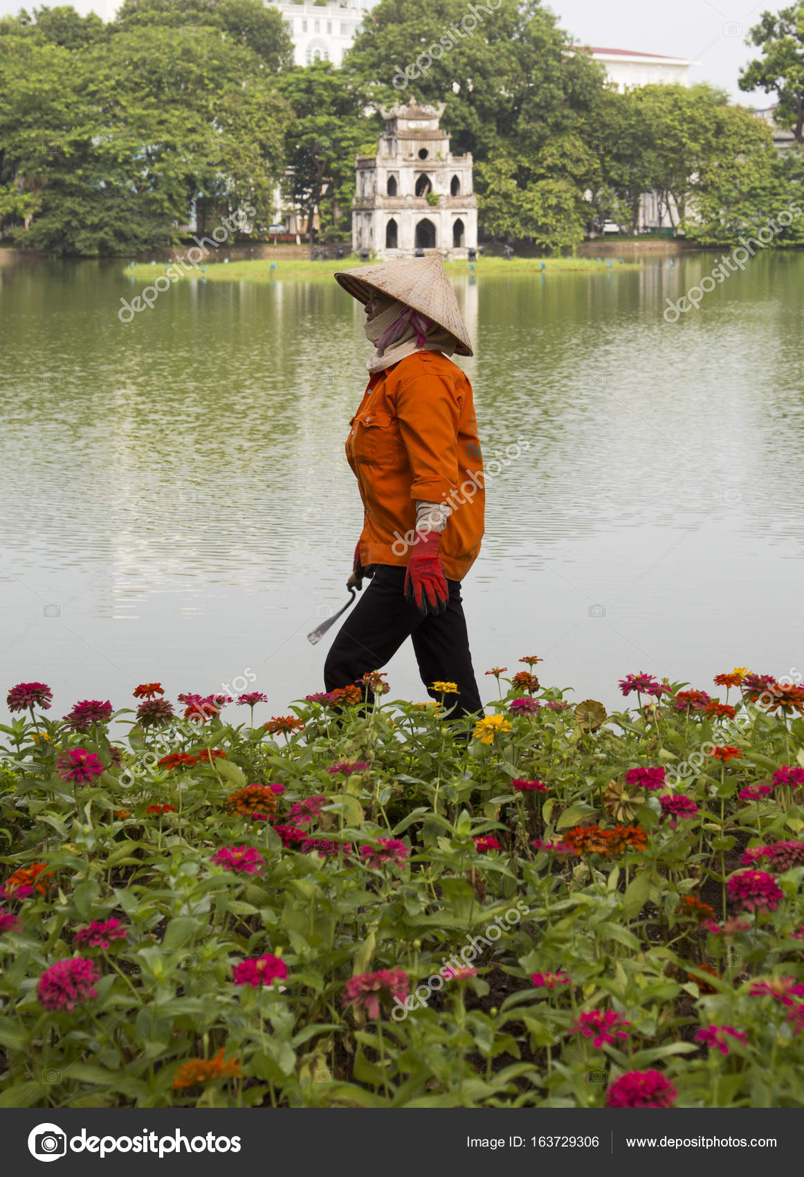 Hanoi Vietnam 10 De Nov 2015 Jardinero Asiatico Que Toma El Cuidado De Un Jardin Botanico De Color Amarillo En La Orilla Del Lago Hoan Kiem